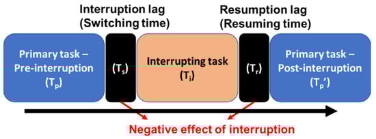 Generally, interrupting peripheral tasks unfavorably affects human behavioral performance and work productivity. It is well known that unexpected, unavoidable interruption causes stress and frustration that can deter task performance, most notably in terms of task completion times and task accuracy during and after interruptions [2,3]. Interruption increases physical and mental workloads, degrades psychological symptoms, and decreases work efficiency [4,5,6]. Interruptions both negatively influence the quantitative outcome of task performance and degrade qualitative performance. Moreover, they may result in frustration, anxiety, frequent errors, delays, and hesitations in a decision-making process [7,8]. These are mainly due to limited cognitive resources that are not well allocated across multiple tasks [9,10,11,12]. Adamczyk and Bailey [13] reported the adverse effects of interruptions based on inopportune occurrence timing, and unexpected interruptions can unfavorably influence task performance and lead to unwanted emotional consequences [14,15].