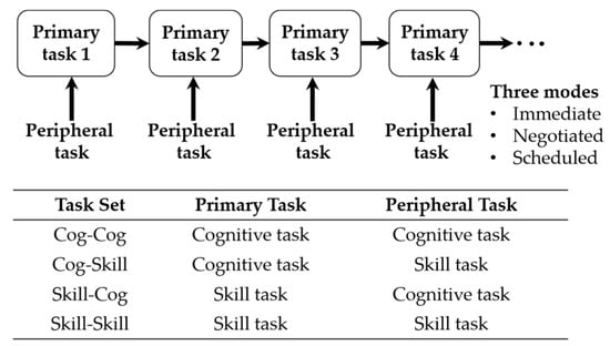 A within-subject experiment design was applied in a series of controlled laboratory experiments. Participants completed three interruption modes (immediate, mediated, and scheduled) with four different primary interrupting peripheral task sets: cognitive/cognitive, cognitive/skill, skill/cognitive, and skill/skill task sets. Both tasks used a visual modality presentation to minimize the effects of extraneous visual stimuli that may have influenced eye-tracking measurements [56]. Because a visual modality is sensitive to environmental conditions and other concurrent modality inputs, the experiment was conducted in a carefully controlled environment. Visual stimulus is only an input channel to collect pupil diameter data without the interference of other sensory inputs. The satisfactory counterbalance for the order of tasks among participants was designed. Figure 2 and Figure 3 shows the experiment framework for this study.