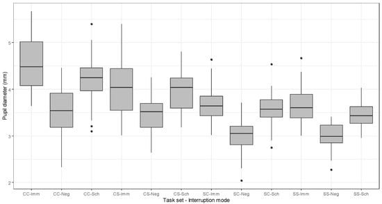 Given that the participants experienced four primary interruption task sets with each of the three interruption modes, a total of 480 pupil diameters (40 participants with 12 task scenarios) averaged for both eyes in each task scenario were obtained. To achieve a uniform sampling rate of 120 Hz, a one-dimensional data interpolation method was employed for the raw measurements. From the collected data, we excluded 11 data that were noisy or failed to detect pupil diameter accurately, and the total number of calculated averages was 469 cases. Though the loss of data did not distort our counterbalanced design, a single imputation method was used to fill in the missing data [58]. Means and standard deviations for pupil diameters for all participants can be found in Table 3 and Figure 4.