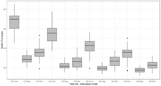 A two-way repeated-measures ANOVA was performed for participants’ responses to the NASA TLX questionnaire. Mauchly’s test confirmed the sphericity assumption in the subjective workload measures from NASA TLX for the effect of interruption mode (χ2 (5) = 7.891, p > 0.05) and the effect of task set (χ2 (2) = 5.743, p > 0.05), and the interaction between interruption mode and task set (χ2 (27) = 35.621, p > 0.05). Therefore, no corrections to degrees of freedom were needed. It also showed a significant effect of interruption modes (F (2, 235) = 4.71, p < 0.01) and task sets (F (3, 235) = 5.29, p < 0.01) on task completion time. No interaction effect was observed. Post hoc LSD pairwise comparisons showed that there was a difference between task sets and their subjective ratings of workload in the immediate mode, but those in the negotiated mode were not statistically differentiated. In other words, as participants delicately perceived the demands in task sets in the immediate mode, they felt that the task was less workload-inducing in the negotiated mode. The analysis results indicated that there was a significant statistical difference between interruption modes and overall subjective workload. Participants felt the highest workload in the immediate mode and the lowest in the negotiated mode. Descriptive statics of NASA TLX can be found in Table 4 and Figure 5.