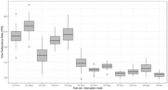 Similar to cognitive workload analysis, a two-way repeated-measures ANOVA was conducted for task completion time measures. Mauchly’s test checked if the sphericity assumption was violated in task completion time measures (time performance ratio, TPR) for the effect of interruption mode (χ2 (5) = 9.281, p > 0.05) and the effect of task set (χ2 (2) = 5.124, p > 0.05), and the interaction between interruption mode and task set (χ2 (27) =37.262, p > 0.05). Therefore, no corrections to degrees of freedom were needed. It also showed a significant effect of interruption modes (F (2, 1225) = 4.71, p < 0.01) and task sets (F (3, 1224) = 5.29, p < 0.01) on task completion time. No interaction effect was observed. Post hoc LSD comparisons showed that the TPR of cognitive primary task sets (cognitive/cognitive and cognitive/skill sets) was significantly higher than skill primary task sets (skill/cognitive and skill/skill sets) in the immediate mode. Similar patterns were shown in the scheduled mode; however, in the negotiated mode, the results of both task sets were not significantly different. Regarding the effect of interruption mode, the scheduled mode (mean = 116.28, SD = 12.01) took the shortest task completion time, and the negotiated mode took the longest time (mean = 168.84, SD = 9.97). This suggests our participants spent more time completing task sets in the immediate mode, and they spent less time in the scheduled and mediated modes. For task sets, skill primary task sets took a similar length of task completion time. Descriptive statics of task completion time can be found in Table 5 and Figure 6.