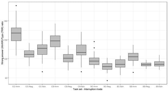 Interruption mode and task set significantly affected task accuracy. Similar to task completion time, the results of a two-way repeated-measures ANOVA revealed statistically significant differences in each subject’s task accuracy among task sets, (F (3, 274) = 27.300, p < 0.05) and interruption modes (F (2, 275) = 7.85, p < 0.001). There was no interaction effect between interruption mode and task set. Mauchly’s test showed that the sphericity assumption was well maintained in task accuracy (wrong answer rate ratio, WARR; and typo rate ratio, TRR) for the effect of interruption mode (χ2 (5) = 8.985, p > 0.05) and the effect of task set (χ2 (2) = 5.743, p > 0.05), and the interaction between interruption mode and task set (χ2 (27) = 31.641, p > 0.05). Therefore, no corrections to degrees of freedom were needed. Descriptive statics of task accuracy can be found in Table 6 and Figure 7.