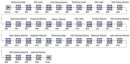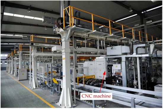 The preventive maintenance strategy developed in present study was used to analyze an automotive part production line located in Shandong Province, China. This production line is comprised of 20 processing machines and it operates 16 h every day. The machines and layout of the automatic production line are shown in Figure 2, and the scene of the production line is shown in Figure 3. The failure rate of each machine was gained accordingly to collect and statistically analyze the production line data including the operating data, failure data and maintenance data. The failure rates of machines in the production line are shown in Table 1.