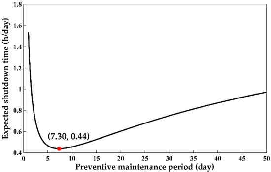 On the basis of the statistics and analysis of maintenance data, the average shutdown time of automatic production line caused by the most critical machines’ failure was 2.4 h (tf = 2.4 h) and the average preventive maintenance time of the most critical machines was 1.5 h (tp = 1.5 h). Then, the parameters F(th), θ, r, tf and tp were taken into Equation (22), and the relationship between the expected shutdown time of the production line and the preventive maintenance period was obtained by MATLAB software, as shown in Figure 4.