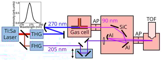Figure 2 shows a schematic illustration of the experimental setup for VUV TRPES using 205-nm pump and 90-nm probe pulses. The fundamental output from a home-built Ti:sapphire amplifier (810 nm, 12 mJ/pulse, 35 fs at 1 kHz) was split by an uncoated fused silica plate, with the minor (a few percent) Fresnel reflection sent for fourth-harmonic generation (FHG, 205 nm) using nonlinear crystals. The main portion (>90%) was sent to a single-pass third-harmonic generation (THG, 270 nm) stage that consisted of a β-BaB2O4 (BBO) crystal for second-harmonic generation, an α-BBO delay-compensation plate, a quartz retardation plate for polarization control, and a β-BBO crystal for type-I THG [5]. These optical components have a fairly large aperture size (⌀12 mm), and a collimated fundamental beam of a large diameter (>5 mm full width at half maximum) was used to avoid two-photon absorption in the THG crystal. The highest pulse energy obtained at 270 nm was 1.5 mJ, corresponding to 13% energy conversion efficiency. However, intense DUV pulses induce nonlinear processes while propagating through air, and the shot-to-shot intensity fluctuation of the 90-nm pulse after the 9th harmonic generation was found to be far worse than that of the 270-nm driving pulse. Therefore, we operated the THG stage with a reduced conversion efficiency. The temporal duration of the 270-nm pulse was measured using a multiphoton ionization process of nitric oxide [18] to be 40–50 fs, which is consistent with the transform-limited (TL) pulse width (~40 fs) calculated from the THG spectrum (Figure 2 inset).