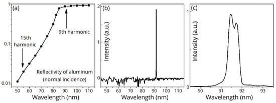 (a) Normal-incidence reflectivity of aluminum. (b) Spectrum of the 9th harmonic after a couple of bounces by bare aluminum mirrors. (c) Spectral shape of the 9th harmonic.