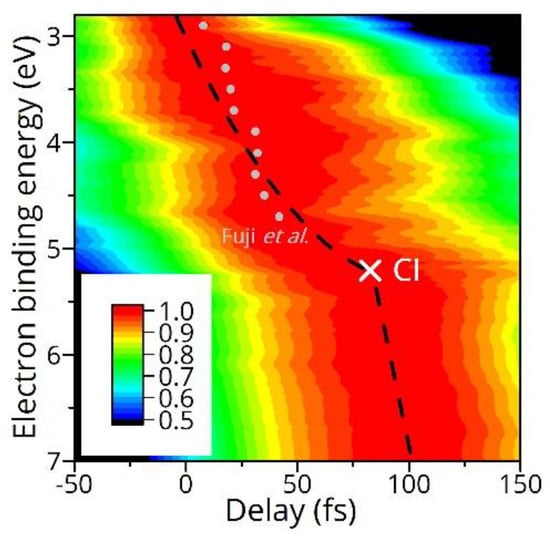 Here we present a few representative results from our recent TRPES studies using 9th harmonic pulses [11,12,13,14,15,16,17]. Figure 4 shows TRPES spectra of furan (C4H4O), where the time profile measured at each eBE has been normalized to unity. This helps to reveal the changes in spectral shape. It is evident that the spectral peak (see dashed curve, which is a guide for the eye) gradually shifts toward higher eBE by several electronvolts within the first 150 fs, as was discussed in the Introduction. We attributed the kink of the spectral shift at τ ~ 90 fs (eBE ≈ 5 eV) to a CI mediating a nonadiabatic transition to the ground state. Also shown as the dotted line is the result we reported previously [9] using DUV probe pulses (hvprobe = 4.7 eV). Notably, the kink at eBE ≈ 5 eV was outside of the observation window using the DUV probe pulses, demonstrating the utility of the VUV probe pulses for TRPES studies.
