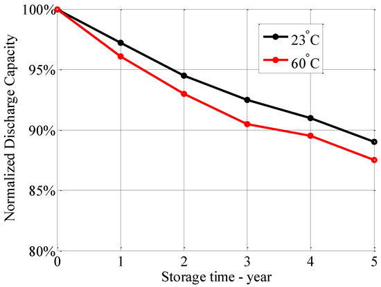 This company then conducted data analysis using the Arrhenius model. The samples stored at 60 °C for 40 days showed 7% capacity loss, whereas the samples stored at 23 °C for 730 days showed 6% capacity loss. The degradation rates at 23 °C and 60 °C were then calculated, respectively, assuming a linear capacity decrease over time as in Equations (4)–(6). Accordingly, the AF of 21.3, and activation energy of 0.703 eV can be derived.