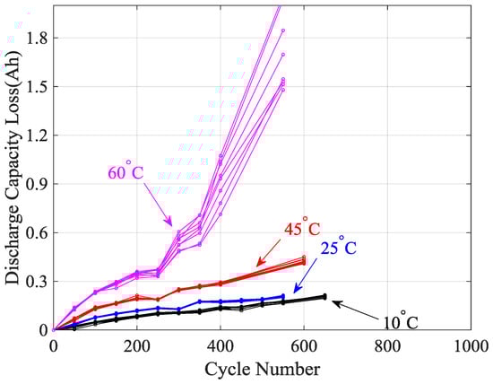 At 10 °C, 25 °C, and 45 °C, the slopes of the discharge capacity loss curves steadily decrease over cycles at first, then maintain at a relatively constant level. At 60 °C, the discharge capacity loss curve in the first 250 cycles shows a similar trend to that at 10 °C, 25 °C, and 45 °C. However, the capacity loss at 60 °C after the 250th cycle increases drastically, forming an inflection point on the curve. This phenomenon suggests that the dominant failure mechanisms have possibly changed after the 250th cycle. It is also found that the eight samples cycled at 60 °C present large variations after the 250th cycle, although with similar degradation trends. Different transition times of the failure mechanisms in these samples may account for this variation.