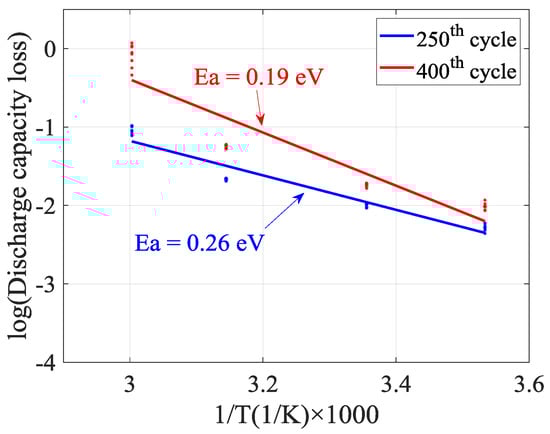 Even if an Arrhenius model is forced to fit all the data with the R-squared of 0.9512 and 0.8945, respectively, as some research groups did [10,15,20], the derived activation energy can change with the cycle number. The analysis above shows that the Arrhenius relationship is not universal to model the effect of temperature on lithium-ion batteries’ degradation rates, since the coefficients are no longer fixed when the capacity loss at different times is selected.