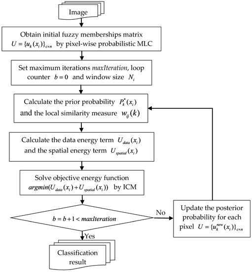 The iteration will stop when is met; otherwise, update the posterior probability for each pixel according to Equations (12), and go back to Step 2 and repeat.