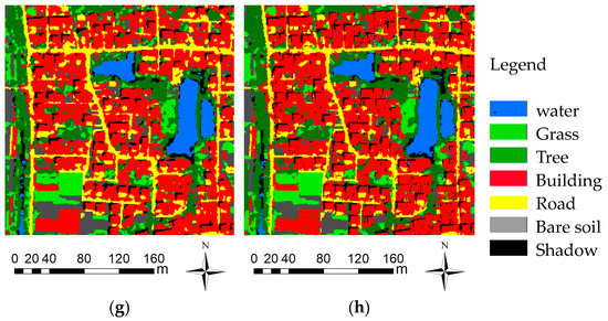 As shown in Figure 3b, MV, GS, and CAMRF-FLI algorithms also have similar OA with small window size, but CAMRF-FLI shows more robust to the window size than MV and GS in terms of OA. Seen from Figure 3b, MV and GS obtain the highest OA at the 5 × 5 window, and CAMRF-FLI achieves the best OA at the 13 × 13 window. Figure 4c–h shows the classification results provided by MLC, MV (5 × 5), MRF, OBV, GS (5 × 5), and CAMRF-FLI (13 × 13) algorithms, respectively. In Figure 4c, for the spectral similarity, MLC obtains a map with “salt and pepper” noise without incorporating spatial information, road and building and bare soil, tree and grass, and water and shadow are confused in the classification result. Figure 4d–h all obtain more homogenous regions than Figure 4c for incorporating spatial information, while MV, MRF, OBV, and GS show weaker performance than CAMRF-FLI. CAMRF-FLI produces homogeneous areas while preserving more image details. Table 2 gives the quantitative results. In Table 2, MV, MRF, OBV, GS, and CAMRF-FLI achieve higher classification accuracies than MLC. Among them, CAMRF-FLI obtains the highest OA and most of the best Producer’s Accuracies. In terms of OA, CAMRF-FLI achieves a value of 79.75%, with gain of 12.89%, 9.52%, 7.35%, 8.01%, and 6.09% over other algorithms, respectively. According to the results of McNemar’s test, all classification accuracies are statistically significant at the 5% level of significance.