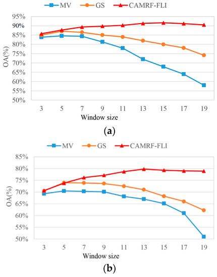 (a,b) shows the OA obtained with different window sizes for MV, GS, and CAMRF-FLI algorithms tested in experiments 1 and 2, respectively.