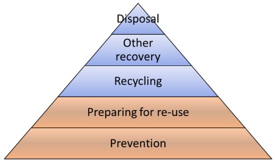 As a follow-up on the Council Directive 1999/33/CE [17], the DIRECTIVE 2008/98/EC OF THE EUROPEAN PARLIAMENT AND OF THE COUNCIL, of 19 November 2008, on waste and repealing certain Directives [18] has the scope of establishing “measures to protect the environment and human health by preventing or reducing the adverse impacts of the generation and management of waste and by reducing overall impacts of resource use and improving the efficiency of such use”. According to this, a waste hierarchy has been established in waste management: (a) prevention; (b) preparing for re-use;(c) recycling; (d) other recovery, e.g., energy recovery; and (e) disposal, as shown in Figure 1. This hierarchy must be followed, both by consumers (a, b) and by waste managers (c, d and e) [18,19].