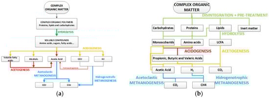 During the anaerobic degradation process, the OM content of FW (or any substrate) is transformed into biogas in a chain process that includes mainly four consecutive steps [85]. These four reactions are (a) hydrolysis, (b) acidogenesis, (c) acetogenesis, and (d) methanogenesis [86]. Figure 2 shows two different and complete schemes of AD reactions and development.