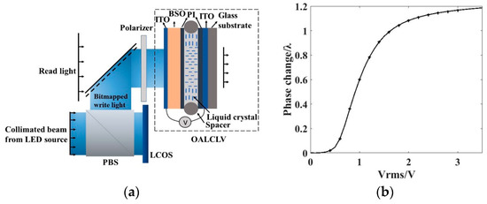 (a) Working principle of the optically addressable spatial-light modulator (OASLM) and structure of the optically addressable liquid-crystal light valve (OALCLV) consisting of the glass substrate, 6-μm-thick liquid crystal (LC), and BSO photoconductor, PI (polyimide, the alignment layer); a reflective liquid crystal on silicon (LCOS) type is used to control the write light, PBS refers to the polarized beam splitter. (b) Phase change of a 6-μm-thick LC cell composed of two glass substrates. The LC has ne = 1.820 and no = 1.515.