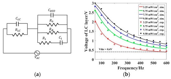 (a) Equivalent circuit of the OALCLV. (b) The voltage values on the LC layer of the OALCLV at the applied voltage of 3.5 V, experimental points and theoretical curves according to Equation (3), for different frequencies of the applied voltage.