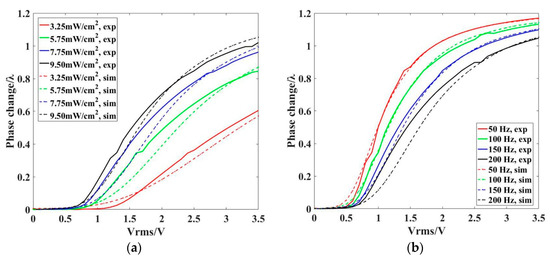 In Figure 3a, the solid lines show the relation between the phase change and VAC at 200 Hz when the OASLM is subjected to four different write-light irradiances of 3.25 mW/cm2, 5.75 mW/cm2, 7.75 mW/cm2, and 9.5 mW/cm2. The dashed line shows the simulated phase-change relation deduced from the voltage response of the LC and Equation (3). The average error-rate between the simulated and experimental values is 3.5%. The figure illustrates that as the write-light irradiance decreases in the range of 9.5–3.25 mW/cm2, the reduction of VLC being approximately 1 V in Figure 2b, which results in a decrease in phase-change PV value of 0.4λ.