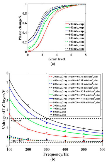 Figure 4a depicts the relationship between the phase change and grayscale values when the OASLM is under a VAC of 14 V at 100 Hz and separately loaded these single-value grayscale images with values from 0 to 0.79 (in the normalized 0–255 grayscale range, 0–0.79 is the linear region of write-light irradiance as a function of grayscale value); meanwhile, the driving current of the LED changes from 200 mA to 800 mA. The dashed line shows the simulated phase-change relation deduced from the voltage response of the LC and Equation (3). The average error-rate between the simulated and experimental values is 2.2%. The figure shows that, with an increase in current, the decrease in the PV value, which is the phase-change ability, is 0.23λ, mainly because of the increase in the phase-change values corresponding to the gray level 0, implying that the corresponding VLC is improved. In particular, we simulated the range of VLC, which corresponds to 0–0.79 gray level when the OASLM is subjected to different driving conditions; the results are depicted in Figure 4b. The marked points correspond to the experimental values, which are basically consistent with the simulated values.