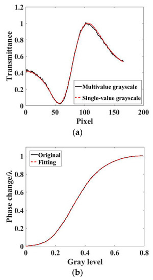 In order to further prove that the modulation results of the multi-value grayscale still satisfy the aforementioned relationship, we designed a gray-level ramp image and loaded it onto the OASLM to modulate the laser beam. The black curve in Figure 6a shows the corresponding one-dimensional (1D) transmittance distribution of the central row measured by the CCD, which has good consistency with the red curve.