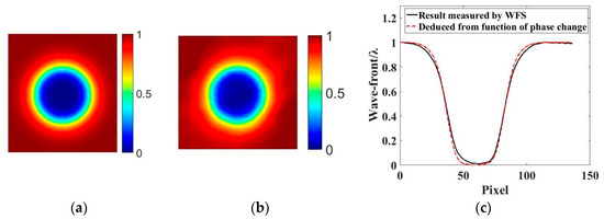 If we design a wave-front using Equation (4) and the actual modulation of the SLM loading the corresponding grayscale image is consistent with it, then we can assume that the transmittance measured by the CCD can monitor the phase-modulation result because the phase function in Equation (4) is directly derived from the transmittance. Figure 7a depicts a phase distribution designed with Equation (4), Figure 7b is the actual wave-front directly measured by the WFS and Figure 7c is a comparison of the 1D distribution of their central row. The modulated result is in good agreement with our designed wave-front.