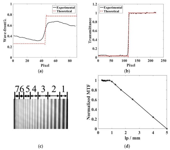 Furthermore, we loaded a binary image with varying periods on our SLM to determine the spatial resolution of the system; the modulation result is shown in Figure 8c, from which we can see that the spatial resolution is at least 200 µm. In Figure 8d, the normalized MTF can be calculated from the relation . From this we can also obtain the spatial resolution of 5 (period of 200 µm, the value of the MTF is 0). At the same time, we can see that the 1 (period of 1 mm, the value of the MTF is 1) is a division. When the value of the X-axis is larger than this, the MTF curve drops sharply to 0, so the minimum distinguishable contrast is 1 mm.