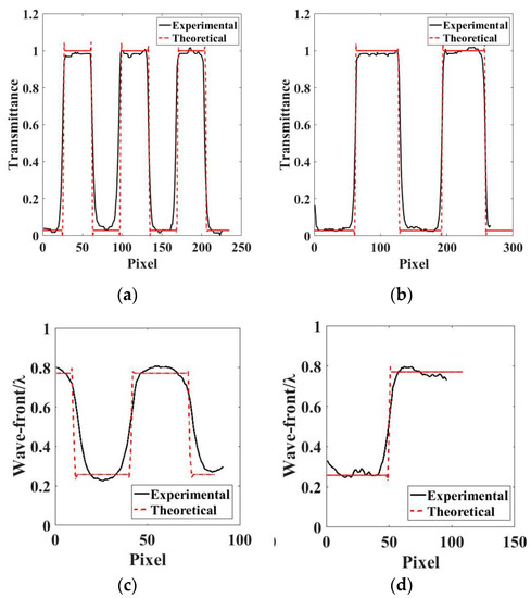 Figure 9b is a chessboard grayscale image with 70-pixel period in the horizontal direction and 128-pixel (the pixel-pitch of the write-light system is 20 µm) period in the vertical direction. The modulation results are shown in Figure 10. The black lines in (a) and (b) correspond to the transmittance measured by the CCD and are basically consistent with the red lines, the theoretical results of the transmittance gray-level relationship. The black lines in (c) and (d) are the 1D distributions of the wave-front measured by the WFS, which have significant differences compared to the theoretical values deduced from the phase-change function and represented by the red lines. Therefore, the monitoring system plays a very important role in the measurement of the modulation results on-line.
