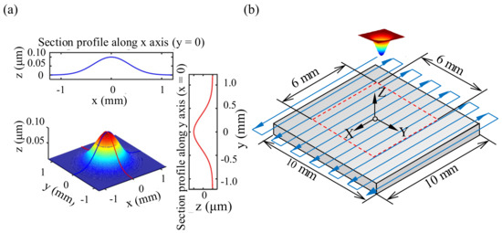 In submerged jet polishing (for narrow sapphire nozzles with a diameter less than 0.3 mm) and other deterministic polishing, the TIF usually presents a Gaussian distribution with a maximum removal at the center. In the simulation study of this paper, the TIF established by the Gaussian mathematical model given in Equation (4) is used, where and represent the material removal area radius (mm) of the TIF in the x direction and the y direction, respectively. a represents the maximum material removal depth per unit time (m/min). Figure 1a shows the rotationally-symmetric three-dimensional TIF profile with a removal radius of 1 mm and a maximum removal depth of m/min. Table 1 gives the parameter values of the TIF used in this paper.