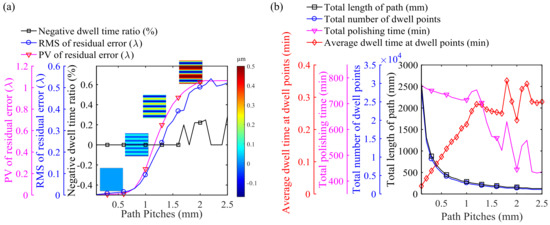 By introducing regularization and sparse matrix operation methods, the dwell time solution algorithm based on the linear equations can effectively control the negative ratio (number of dwell points with a negative dwell time calculated/total number of dwell points) of dwell time calculated to be less than 1%, as shown in Figure 2a. Note that the influence of path spacing on the RMS and PV values of the residual error is almost consistent when bulk material removal depth is constant. As the path spacing increases, the RMS and PV values of the residual error first increase slowly and approximately linearly within the range of 0.1 mm to 0.6 mm, then rapidly increase within the range of 0.6 mm to 2.0 mm and finally stabilize in the range of 2.0 mm to 2.5 mm. This is because the deterministic polishing removal is caused by the convolution effect formed by the overlap of tool influence functions. When the distance between the paths is small, i.e., less than 3/10 of the diameter of the TIF, convergence of the deterministic polishing removal process can be effectively ensured. From the residual error profile in Figure 2a, it can be seen that as the path spacing increases, it becomes increasingly difficult to ensure convergence of the regions between adjacent paths. When the distance between the paths is larger than the diameter of the TIF, the material between the adjacent paths cannot be removed. In this case, the PV values of the residual error will be slightly larger than the original surface form error and remain basically constant. However, it should be pointed out that the RMS curve is fluctuating more at these later stages than the PV curve. This may be because the RMS value of the residual error is more susceptible to dramatic changes in convergence of the surface form error.