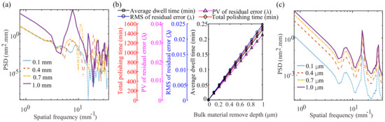 Figure 3b shows the influence of the bulk material removal depth on the residual error when the path spacing is constant. With the increase of bulk material removal depth, RMS and PV values of the residual error showed a linear growth trend. This also reflects the linear decreasing trend of convergence of deterministic polishing with the increase of the bulk material removal depth. With the increase of the bulk material removal depth, the linear increase of the polishing time indicates that polishing time has a positive correlation with the amount of material removal. Since the number of pre-planned dwell points remains constant, the average dwell time allocated to each dwell point increases accordingly. Figure 3c shows the power spectral density calculation results for the residual error along the vertical direction of the planned path for different bulk material removal depths (0.1 m, 0.4 m, 0.7 m, 1.0 m) when the path pitch is 0.2 mm. It can be seen that the profiles of the power spectral density curve corresponding to different bulk material removal depths are similar, but as the bulk material removal depth increases, the power density amplitude corresponding to each spatial frequency shows a significant increase. This may be because with the increase of the bulk material removal depth, the dwell time of each dwell point is prolonged. The increase in the dwell time of the polishing tool at a certain point will make the path effect more pronounced, thereby introducing deeper ripple errors caused by the tool path. Therefore, for a large form error, a small path spacing should be preferred, which can effectively improve the convergence of deterministic removal, reduce the RMS and PV value of the residual error and effectively suppress the MSF error component in the residual error.