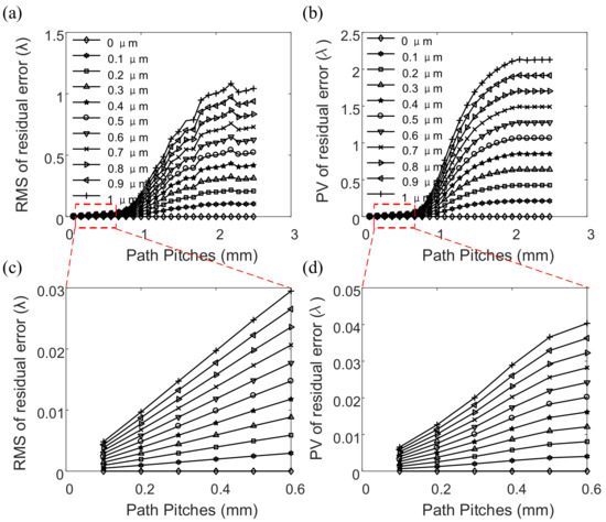 As can be seen from Figure 4a,b, the influence law of path spacing variations on the RMS and PV values of residual error resulting from different bulk material removal depth is consistent. For deterministic polishing removal, a reasonable polishing path spacing value should be less than 3/10 of the diameter of the TIF. When the value is within this range, drastic variation of RMS and PV values of the residual error can be effectively avoided. Therefore, in this simulation, the RMS and PV curves with a path pitch of less than 0.6 mm are the parts of interest. As can be seen from the partially enlarged view, shown in Figure 4c,d, the slope of the curve increases significantly with the increase of the form error. This indicates that the larger the bulk material removal depth, the greater the effect of the change in the path spacing on the residual error, which makes the subsequent adjustment of the path spacing more useful, especially for regions with large bulk material removal depth.
