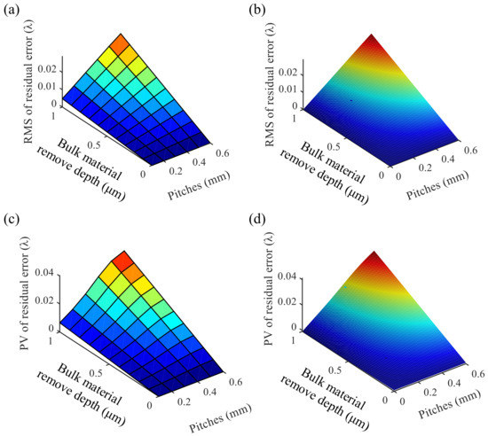 As shown in Figure 6b,d, the ideal RMS and PV values for the two optimized models are RMS = 0.0097342 and PV = 0.013193 , respectively. However, we found that RMS and PV values obtained after optimization are about 20% larger than the target values. This may be related to the fact that the bulk material removal depth varies in the adjacent path interval caused by varying surface form error, unlike the constant bulk material removal depth in the experiment in Section 3.