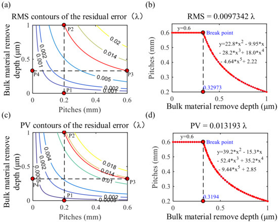Similarly, the PV contour of residual error and the relationship between the bulk material removal depth and the path spacing based on the PV map are obtained, as shown in Figure 6c,d. A comparison of Figure 6b,d shows that the trend of the two curves is similar, which is attributed to the similarity of the effects of bulk material removal depth, and path spacing on the RMS and PV values of the residual error. A piecewise polynomial fitting method was used to fit the two curves, respectively, and the path spacing optimization models based on the RMS map (Equation (5)) and the PV map (Equation (6)) were obtained, respectively.