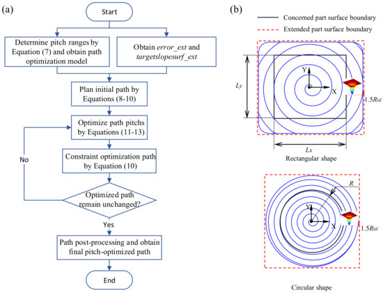 In order to realize the optimization process of the spiral polishing path efficiently and quickly, this paper proposes to plan the variable pitch spiral polishing path on a two-dimensional plane. Moreover, the path pitch along the radial direction of the spiral path is iteratively optimized according to the proposed path spacing optimization model in Section 4.2. At the same time, when the variable pitch 2D path is projected onto a 3D target surface, in order to avoid as much as possible the impact of slope change on the pitch of the projected path, a path spacing compensation factor based on the gradient change distribution of the target surface is introduced. After several iterative optimizations, the final variable pitch spiral-polishing path with seamless transition will be obtained. Figure 7a gives the complete planning flowchart for the optimized path with variable pitch.