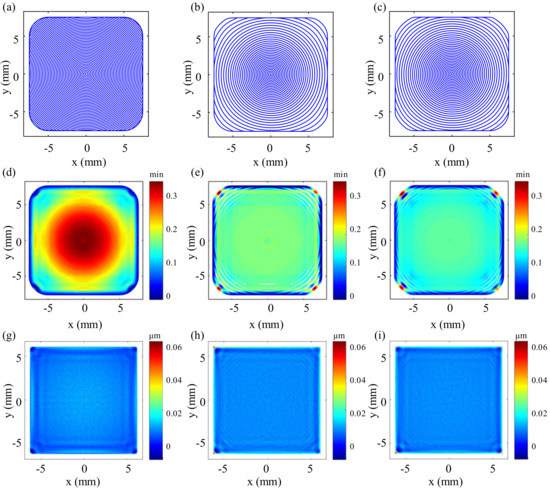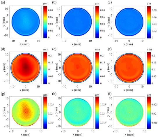 By solving the dwell times corresponding to the three polishing paths, the dwell time distribution maps corresponding to the three polishing paths are obtained, as shown in Figure 9d–f. It can be seen from Figure 9d that the dwell time distribution corresponding to the initial equally-spaced spiral polishing path is consistent with the initial form error distribution. It further verifies the experimental results obtained in Section 3.2.2, that is, when the path spacing is constant, there is a positive linear relationship between the dwell time of each dwell point and the amount of form error. For the optimized paths, especially in the regions we care about, the dwell time of each dwell point does not change very much. From Figure 3b in Section 3.2.1, it can be seen that there is also a positive linear relationship between the path spacing within a certain range (0.2 mm–0.6 mm) and the dwell time of each point when bulk material removal depth is constant. It is under the combined influence of bulk material removal depth and path spacing that the dwell time at each point on the optimized path remains mostly the same. To some extent, the optimized path is a good way to improve dwell time distribution. Since spacing of the planned dwell points along the path is basically the same, the optimized polishing path will run under a more stable polishing speed, which is crucial for obtaining a stable polishing process [24]. Figure 9g–i respectively shows the residual error distribution obtained by figuring the extended form error using the three polishing paths, respectively. It can be seen that the strategy of extending the path and the surface form error effectively prevents material removal of the region of interest from being affected by the edge-warping phenomenon. Compared to the residual error distribution before optimization, the imprint of the initial surface form the error distribution can hardly be found visually in the optimized residual error distributions.