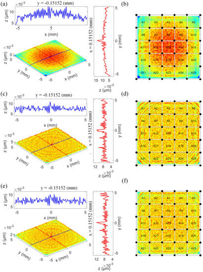 As shown in Figure 10a,c,e, in order to further clearly compare and quantify the difference of the residual error distribution before and after optimization and the effects of two optimization models on the residual error distribution, the residual error distribution of the region of interest is extracted. At the same time, two cross-sectional profiles passing through the center origin and parallel to the x-axis and y-axis are respectively given for each residual error distribution. From Figure 10a, it can be seen that the residual error distribution corresponding to the unoptimized polishing path is highly similar to the distribution of the parent surface form error shown in Figure 8a, that is the error shows a decreasing trend from the center to the periphery. However, the residual error distribution after optimization shown in Figure 10c,e, respectively, is more flattened and is almost unaffected by the distribution of parent form error.