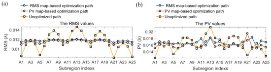 There are multiple outlier points on the PV curve given in Figure 11b, which appear at the positions of A1, A5, A13, A21 and A25, respectively. Comparing the residual error distribution shown in Figure 10, we can see that these outlier points appear at the center of the residual error region and at the four edge corners, respectively. The reason for the abrupt change of PV value in the residual error region corresponding to A13 is related to the center effect produced by the spiral path polishing. The sudden change in PV value at the four edge corners may be related to a 90 degree change in the polishing direction of the planned polishing path at the four corner points. Regardless of the above outlier points, it can be seen that the residual errors obtained by using the PV-map-based optimization model have smaller and closer PV values. In addition, it can be seen that the RMS-map-based optimization model improves the spread of PV values over the sub-regions of residual error.