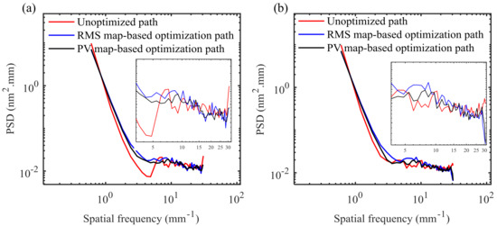 Power spectral density analysis was performed on the residual errors obtained by the above three polishing paths, and the results along the x-direction and y-direction are, respectively, shown in Figure 12a,b. It can be seen from the PSD curves that whether the path optimization model is based on the RMS or PV map, the amplitude variation of the power spectral density of the mid-spatial frequency components in the residual error obtained by the optimized path is more stable. It can be concluded that the proposed optimization strategy can effectively smooth the distribution of MSF error components in the residual error.