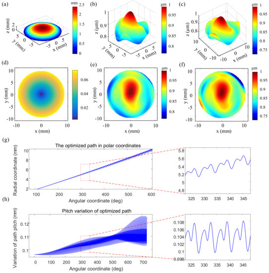 Figure 13d shows the slope distribution corresponding to the aspherical surface. It can be seen that the slope of the surface is rotationally symmetric and gradually increases from the center to the periphery. Figure 13b,c,e,f respectively shows the isometric and top view of the aspherical surface form error and of the extended surface form error obtained after extending a distance of . Since the material removal depth variation in all regions in this case is small (about 0.75 m to 1 m), the chosen minimum path in Equation (7) and its variation range are narrow. The path obtained in the Cartesian space is too dense to observe the effect of pitch change by the naked eye; thus, Figure 13g,h gives the RMS-map-based optimization path in polar coordinate and its pitch-variation along the path.
