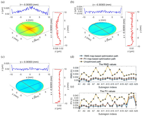 Residual error of the concerned surface region polished along: (a) the unoptimized path; (b) the RMS-map-based optimized path; and (c) the PV-map-based optimized path; (d) RMS and (e) PV curves for sub-regional evaluation.