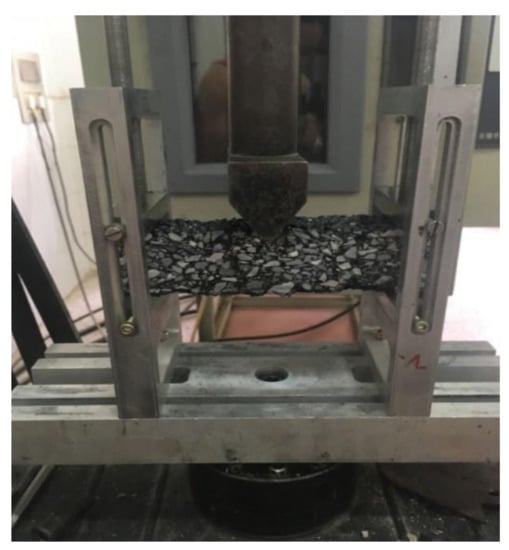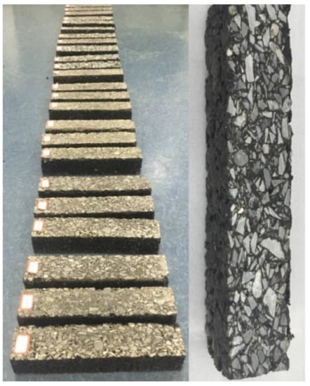 Three asphalt contents (OAC, OAC+0.5%, and OAC−0.5%) and four PAN fiber contents (0, 0.15%, 0.3%, and 0.45% by weight) were used in the experimental design. The mixture was compacted using a roller compactor following the Chinese Standard Test Methods of Bitumen and Bituminous Mixtures for Highway Engineering (JTG E20-2011) [25]. After compaction, the slabs were cut into flexural fatigue beam specimens with dimensions of 50 mm width, 50 mm height, and 250 mm length, as shown in Figure 3. At least three beams were prepared for every strain level. Air voids of flexural beams ranged between 7 ± 1%.