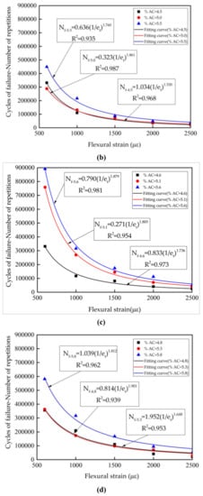 Relationship between flexural strain and fatigue life (%AC is asphalt content in figure). (a) Without fiber; (b) 0.15% fiber content; (c) 0.30% fiber content; and (d) 0.45% fiber content.