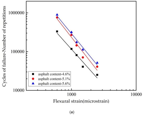 From Table 5 and Figure 5 and Figure 6, it can be seen that the regression results have shown that the correlation coefficient, R2, of each regression equation determined by Equation (1) is quite high. This means that the regression equation fits well. Compared with the mixture with fiber or without, the average value of the fatigue parameter, k2, declined by about 25%. It is shown that the fatigue sensitivity to the strain decreased significantly after adding fiber into the mixture. The anti-fatigue ability improved significantly. A seen in Figure 6a, the fatigue performance of the mixture was also improved with the asphalt content increasing at the same fiber content. It also can be seen from Figure 7, in the condition of low strain, that the effect of the fiber content on the fatigue life is more obvious than that in the condition of high strain.
