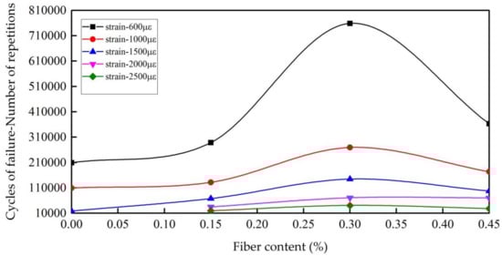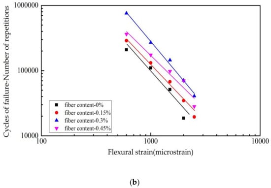In Figure 6b and Figure 7, the reinforced asphalt mixture obviously has an optimum fiber content for the fatigue life. When the fiber content is less than the optimum level, the fatigue life increases monotonically as the fiber content increases. Once above the optimum level, the fatigue life actually falls as fiber content increases. The potential reasons are: