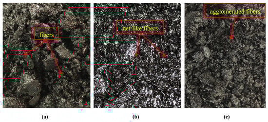 - It also can be seen from Figure 8c, when the amount of fiber is excessive (above the optimum content), the redundant “free fibers” will appear in the mixture. Those “free fibers” even agglomerate somewhere. These “free fibers” and agglomerated fibers will weaken the cohesion between the asphalt and aggregate. It leads to a decrease of the fatigue life of the mixture.