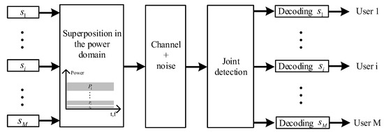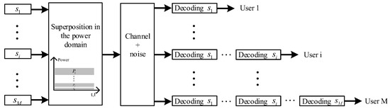 where is the signal intended for the i-th user and denotes the corresponding power allocation coefficient. In addition, due to the normalized total power constraint, the power allocation coefficients should satisfy . Thus, at the receiver side, the received signal at the m-th user can be represented as: