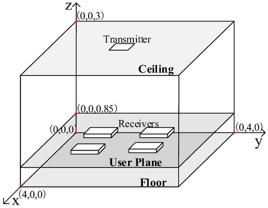 where represents additive white Gaussian noise (AWGN) with zero mean and variance . denotes the channel coefficient between the LED transmitter and m-th user. Since the power of the non-line-of-sight (NLOS) signals is much weaker than that of the line-of-sight (LOS) signal for VLC channels, we assume that LOS links between the transmitter and the receivers [20,21]. Then, is determined by: