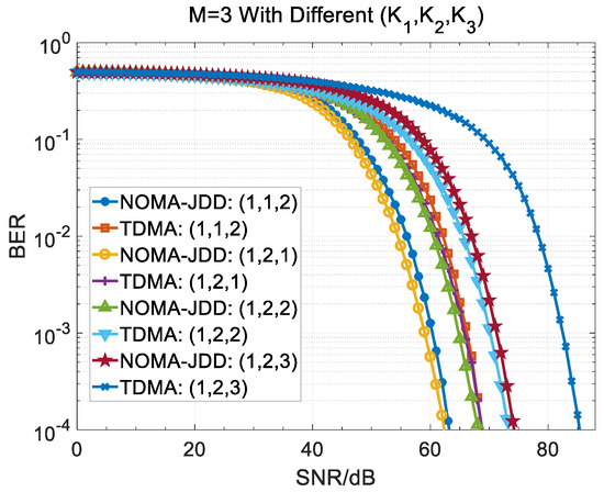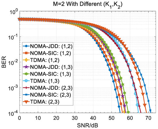 As illustrated in the above simulations, our proposed transceiver design for NOMA significantly outperforms SIC-based NOMA and TDMA. Using our proposed NOMA-JDD scheme, we can achieve higher rates of data transmission than using TDMA or NOMA-SIC with the same BER and SNR.