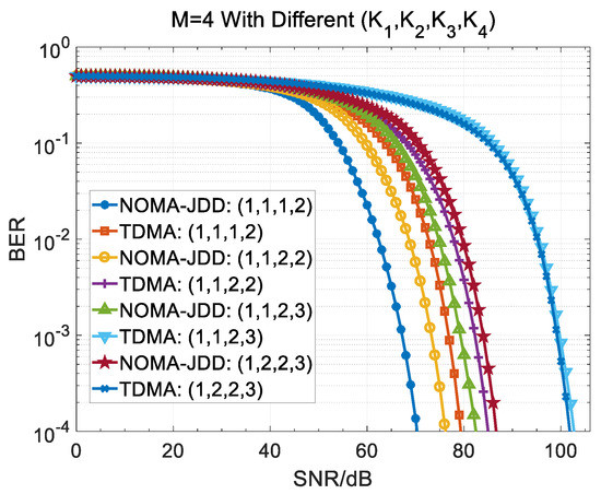 We first compare the average BER performance of our proposed NOMA scheme and the conventionally used TDMA. The transmitted signals of the two schemes are shown in Table 2, and we consider that all the users are randomly distributed on the user plane, as illustrated in Figure 2. We randomly select 20 user groups to simulate their average BER performance, and the simulation results for two, three or four users per user group are shown in Figure 4, Figure 5 and Figure 6, respectively. From these figures, we can get that our proposed NOMA scheme significantly outperforms the conventionally used TDMA. For example, the average gain of our proposed NOMA scheme over TDMA at the error rate of is about 7 dB for . The main reason for this is that the error performance is dominated by the MED of the received constellation, and the ratio of MED of our proposed NOMA and TDMA is determined by: