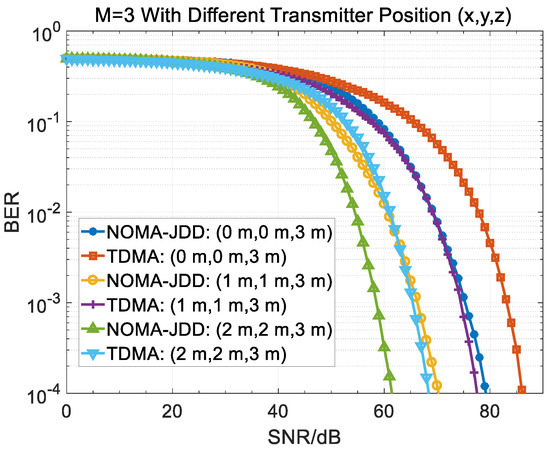 Then, for , the obtained gain of our proposed NOMA over TDMA is given by dB, which is consistent with the simulation results in Figure 4. In addition, we simulate the average BER performance of our proposed NOMA scheme with different transmitter LED position, and the simulation results are illustrated in Figure 7. From this figure, we can see that no matter where the transmitter LED is, our proposed design has a good performance over TDMA.